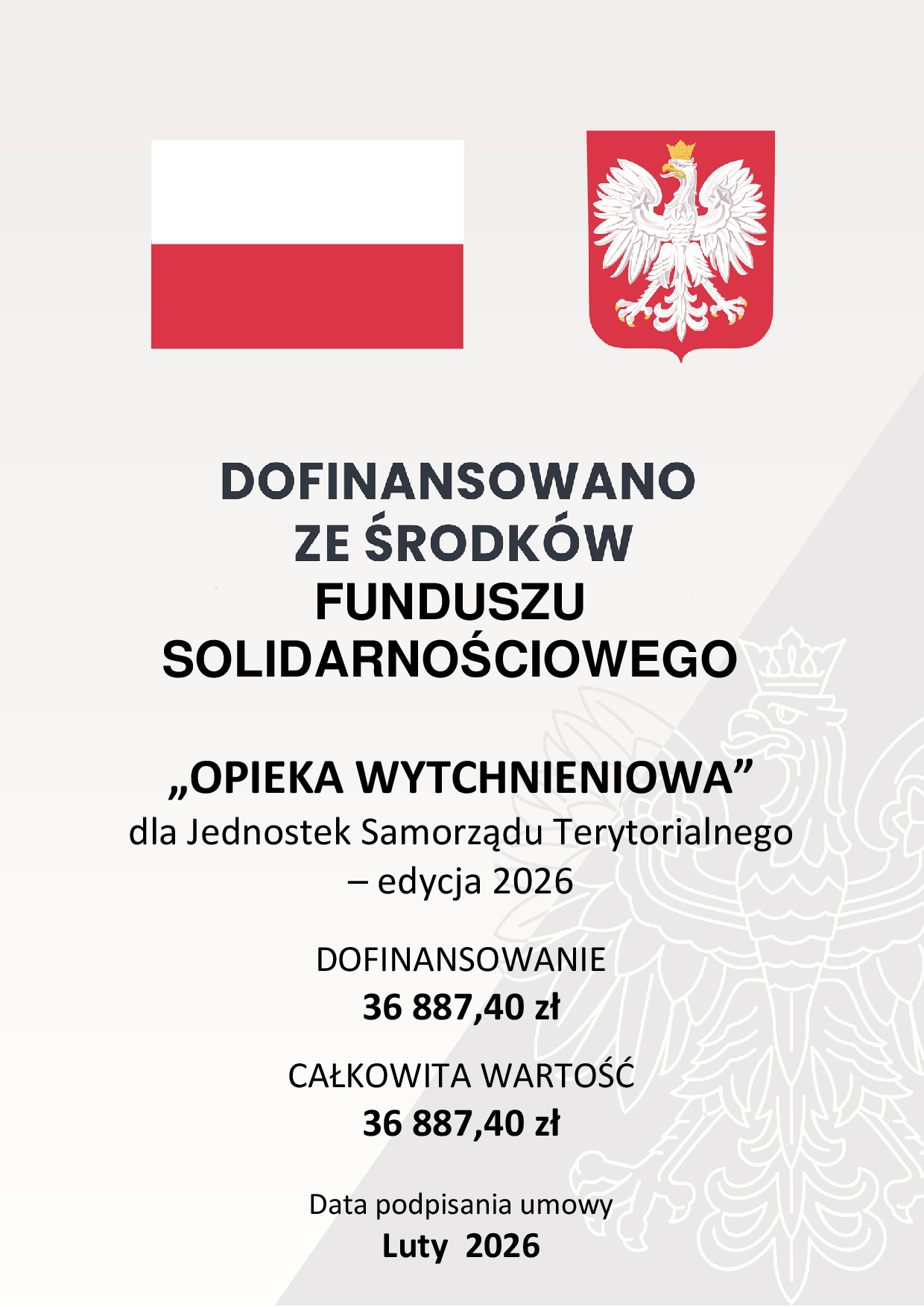 Zgodnie z Umową RE-II.260/2026/OW/PDZ Wojewoda Podkarpacki przyznał Gminie Radomyśl Wielki środki finansowe w wysokości 36 887,40 zł z Funduszu Solidarnościowego na realizację zadania w ramach resortowego Programu Ministra Rodziny, Pracy i Polityki Społecznej "Opieka wytchnieniowa"